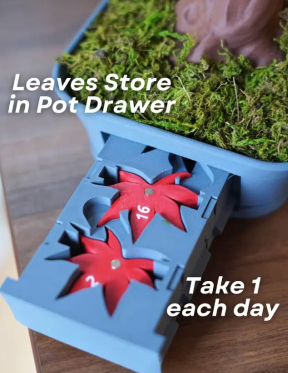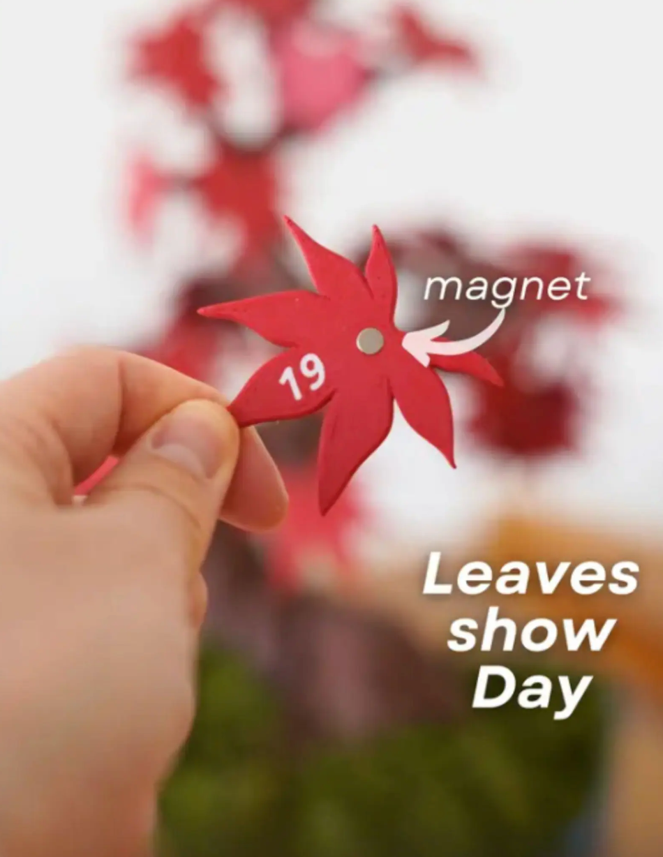 To start the month, remove all the leaves from the tree. On the first day of the month, place the 1st leaf in front of the rock in the pot. Then on the 2nd day, swap leaf 1 with leaf 2 and place it on the tree. Repeat each day of the month to keep track of the date and to watch your tree bloom! At the end of the month, swap the month card inside of the rock.